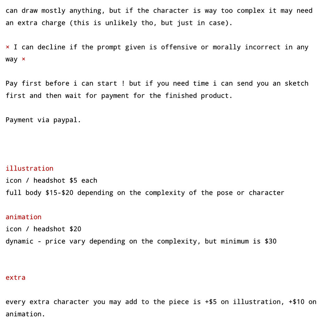 Fetish related stuff must be asked first, but im open to these things.Every extra character you may add to the piece is +$5 or +$10 depending on complexity.